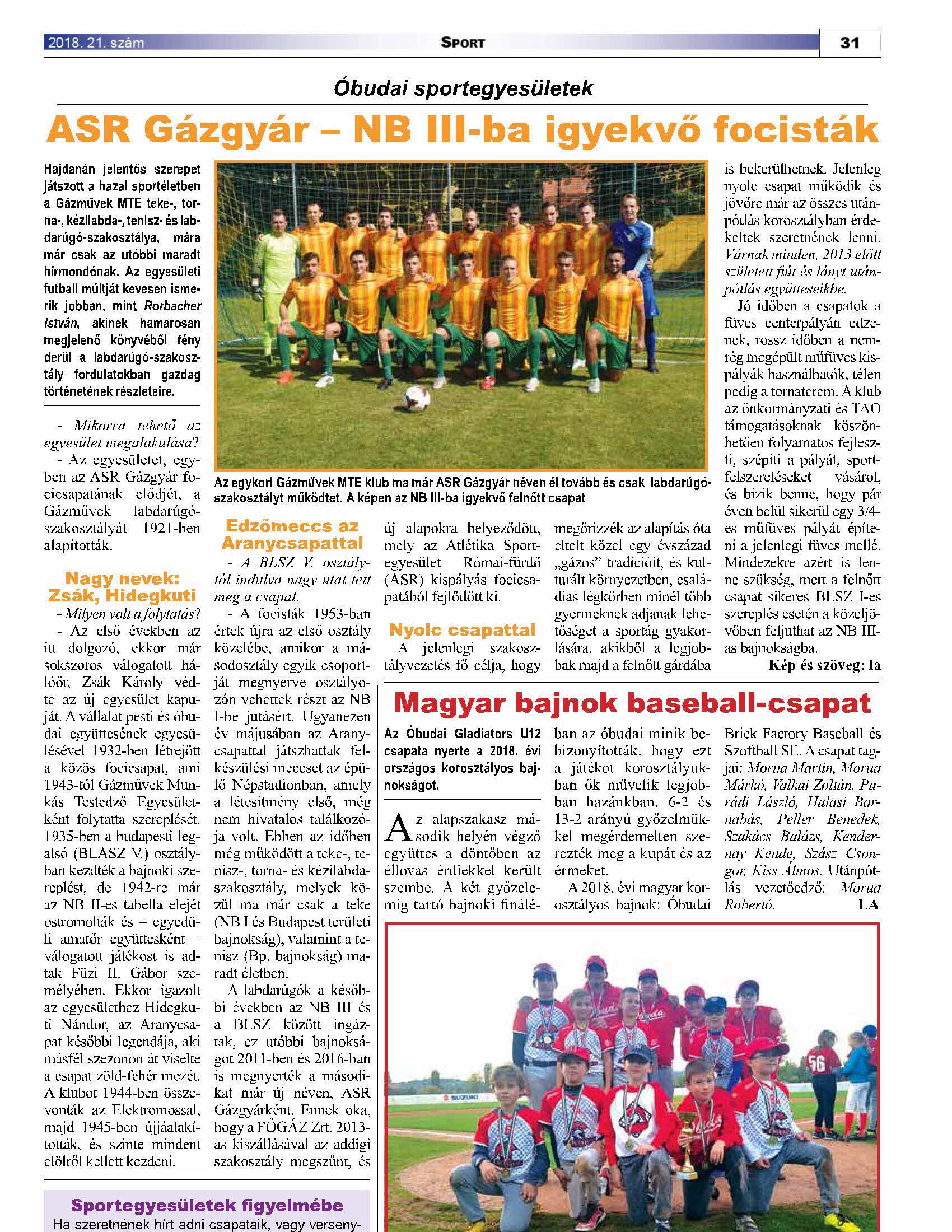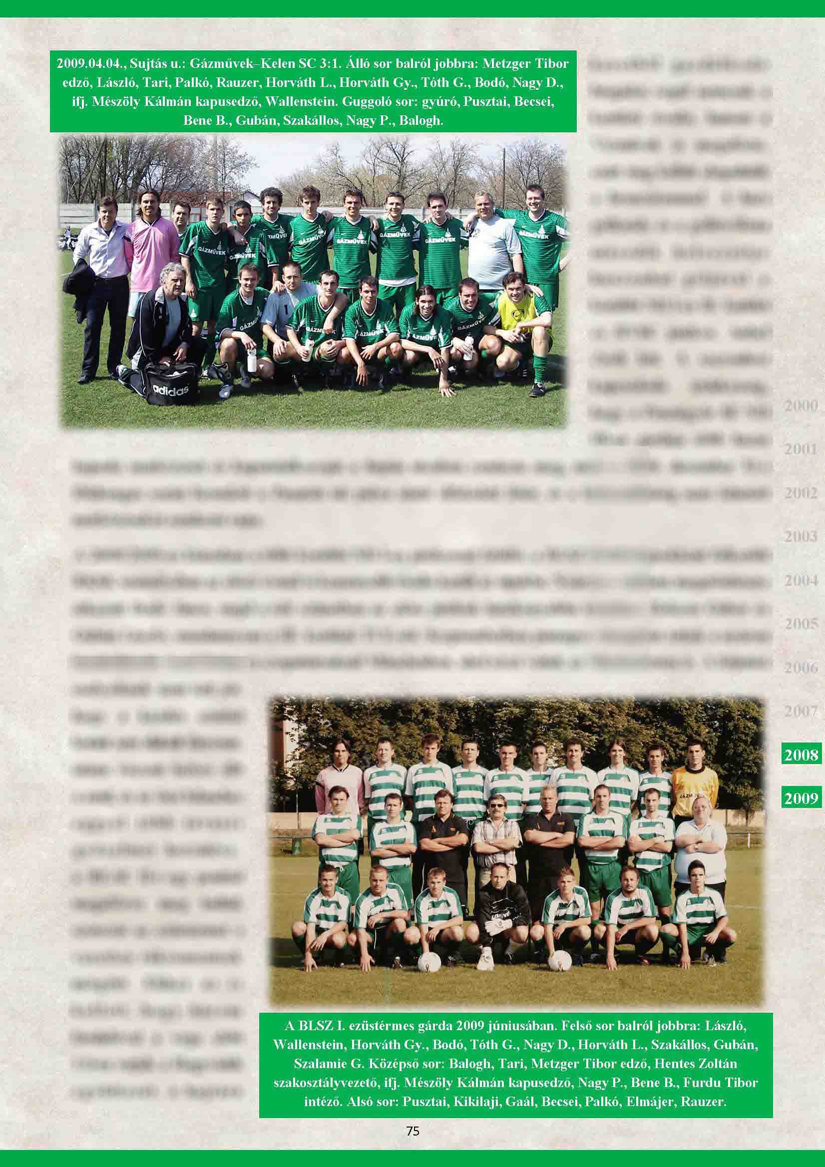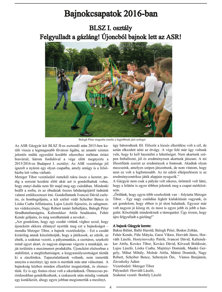 Interjú első csapatunk vezetőedzőjével, Metzger Tiborral az interjúk menüpontban (itt)! Felnőtt II. elhalasztott 9. forduló meccs eredménye itt! Sorsoltak a Budapest Kupában! Első csapatunk a 3. fordulóban a Közterület ellen fog játszani február 18-19-én, minden bizonnyal a SZAC műfüvén. Kedves Honlaplátogatók! Nagy kéréssel fordulnék Hozzátok! Több mint hat év után, nem kevés munkával sikerült megírnom és nyomdai előállításra előkészítenem a Gázművek MTE - ASR Gázgyár labdarúgócsapatának történetéről szóló könyvemet. 360, A4-es, színes oldal lett, 300 db feletti fotóval, klubtörténettel, 22 db interjúval/visszaemlékezéssel, 80 év bajnoki eredményeivel+tabelláival, az első csapatban szerepelt játékosok adatbankjával szezononkénti lebontásban, és számos kiegészítő anyaggal. Több helyen utána érdeklődtem, hogy mennyibe kerülne ennek előállítása 1000 példány esetén, de sajnos nem áll rendelkezésemre kellő anyagi keret a kiadásához. Viszont vállalkozások esetében létezik olyan megoldás, hogy a könyvkiadásra (mint kulturális termékre) szánt támogatásukat leírhatják az adójukból (nem TAO!). Ennek módjáról, mikéntjéről már tájékozódtam, és szándékosan nem írtam, hogy mennyibe kerülne a megvalósítás, mert bármilyen nagyságú segítség jól jönne! Szeretném a művet jövő év első negyedévében megjelentetni. Bárki, aki érez valamit klubunk iránt, szokta olvasni a honlapot, nézni a képeket, a meccsbeszámolókat, vagy egyszerűen csak segíteni szeretne, kérem, tegye meg! Az elérhetőségem: roripisti22@t-online.hu Köszönettel: Rorbacher István Néhány oldal a kiadandó könyvből: