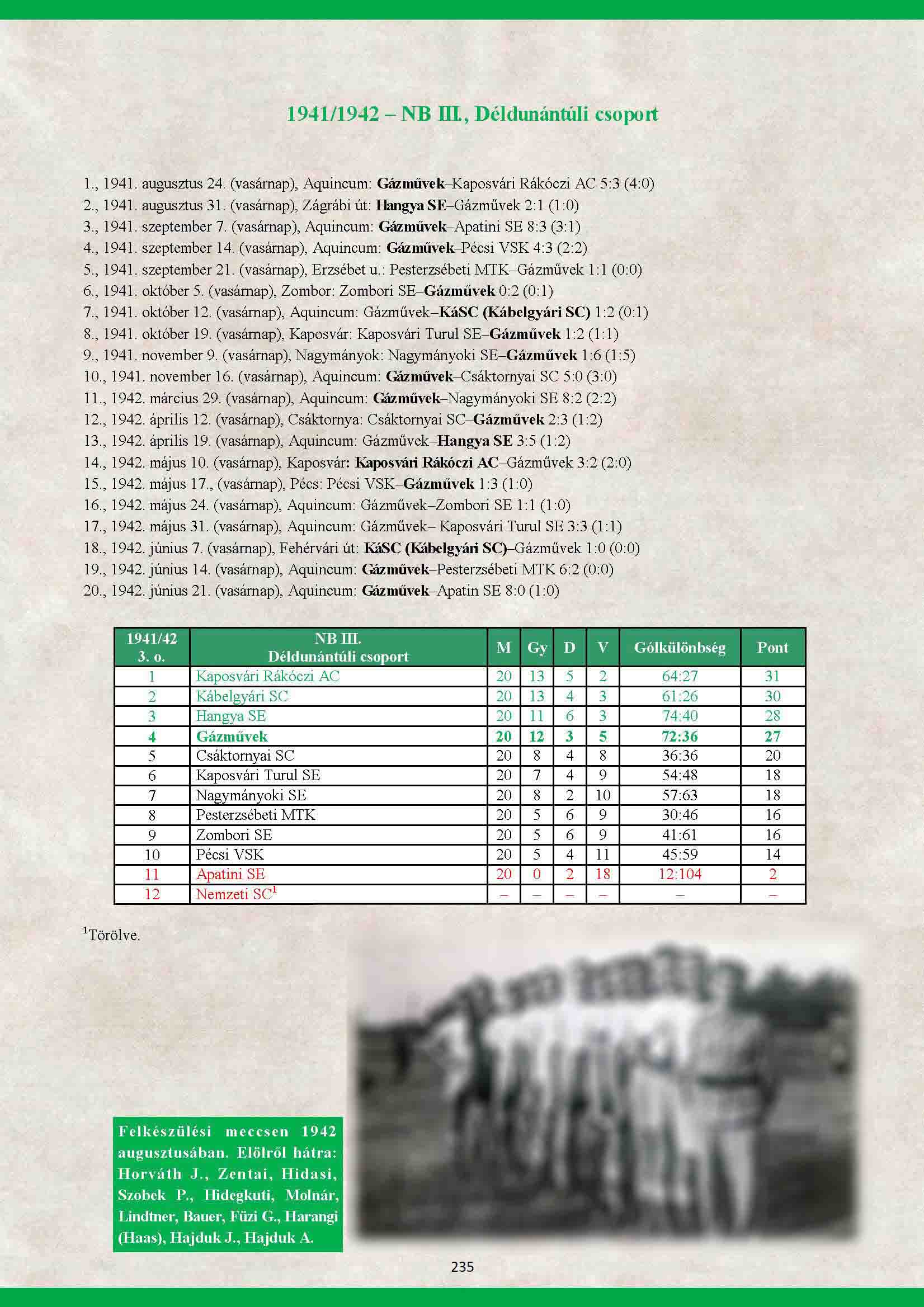 14. forduló 1942. május 10. (vasárnap), Kaposvár, 1200 néző Kaposvári Rákóczi AC – Gázművek 3-2 (2-0) Gázművek: Mezőlaki – Hajduk, Brumbauer I. – Harangi, Majsa, Bauer – Horváth, vitéz Hidegkuti, Füzi, Repcsik, Zentai Góllövő: Avar (2, 1-et 11-esből), Győrfi ill. Füzi, Harangi (11-esből) Szerencsés győzelem. A hazai csapat az utolsó percben lőtt 11-essel szerezte meg a győzelmet. A döntetlen igazságosabb lett volna. Tizedik bajnoki forduló meccs eredménye itt! A beszámoló itt, a képek itt! Utánpótlás csapataink legutóbbi bajnoki eredményei:
