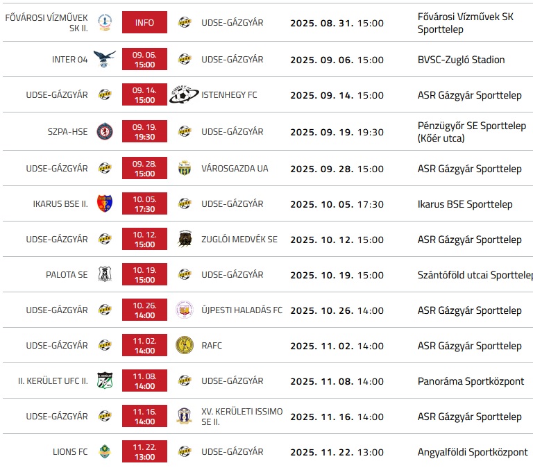 Tizenötödik fordulóbeli Budafok II. meccs eredménye itt! A beszámoló itt, a képek itt! Tizennegyedik fordulóbeli II. kerület UFC meccs eredménye itt! A beszámoló itt, a képek itt! Tizenharmadik fordulóbeli Unione meccs eredménye itt! A beszámoló itt! Tizenkettedik fordulóbeli Ludovika meccs eredménye itt! A beszámoló itt, a képek itt! Tizenegyedik fordulóbeli THSE meccs eredménye itt! A beszámoló itt, a képek itt! Tizedik fordulóbeli REAC meccs eredménye itt! A beszámoló itt, a képek itt! Második Budapest Kupa fordulós Airnergy meccs eredménye itt! Kilencedik bajnoki fordulóbeli Testvériség meccs eredménye itt! A beszámoló itt, a képek itt! Nyolcadik bajnoki fordulóbeli Budai FC meccs eredménye itt! A beszámoló itt, a képek itt! Hetedik bajnoki fordulóbeli Issimo meccs eredménye itt! A beszámoló itt! Az Airnergy ellen elhalasztott Budapest Kupa meccsünk 10.16-án (szerdán) 19:00-kor kerül megrendezésre a Szabadkikötő-pályán. Hatodik bajnoki fordulóbeli SZAC meccs eredménye itt! A beszámoló itt, a képek itt! Ötödik bajnoki fordulóbeli Flotta meccs eredménye itt! A beszámoló itt, a képek itt! Az Airnergy elleni Budapest Kupa meccsünk halasztásra kerül. Negyedik bajnoki fordulóbeli TFSE meccs eredménye itt! A beszámoló itt, a képek itt! A Budapest Kupa második (szeptember 18-19-i) fordulójában csapatunk a BLSZ II-es Airnergyt kapta, minden bizonnyal a Szabadkikötő pályán. Első bajnoki fordulóból újrajátszott Csepel UFC meccs eredménye itt! A beszámoló itt, a képek itt! Harmadik bajnoki fordulóbeli 43. sz. Építők meccs eredménye itt! A Csepel UFC elleni félbeszakadt bajnokit szeptember 4-én, 17:30-kor játszuk újra. Második bajnoki fordulóbeli Vízművek meccs eredménye itt! A beszámoló itt, a képek itt! Váratlan, de örömteli hír a BLSZ versenybizottsági határozata alapján: "Az UDSE-Gázgyár – Csepel UFC 2022 KFT (1 – 2) BLSZ I. osztály 1. fordulójában kisorsolt bajnoki labdarúgó mérkőzés a második félidő 75. percében az időjárási viszonyok miatt félbeszakadt. A VB a mérkőzés újrajátszását rendelte el. Az új időpontot haladéktalanul jelentsék be a VB-nek. LVSZ 43. §(1) f) (1)" Első bajnoki fordulóbeli Csepel UFC meccs eredménye itt! A beszámoló itt, a képek itt! Rövid interjú első csapatunk vezetőedzőjével, Theo Schneiderrel a szezonkezdet előtt: asrgazgyar.fw.hu Theo Schneider asrgazgyar.fw.hu Theo Schneider asrgazgyar.fw.hu Theo Schneider asrgazgyar.fw.hu Theo Schneider asrgazgyar.fw.hu Theo Schneider asrgazgyar.fw.hu Theo Schneider Ötödik felkészülési meccsünk eredménye itt! A BLSZ I. 2024/25-ös őszi sorsolása innen letölthető! Felnőtt csapatunk a 2024/25-ös szezonban végül a tavaszihoz hasonlóan UDSE Gázgyárként fog indulni! Alakul a keret: Eddigi igazolásaink: Benkő Márton (2003) Dabas Felnőttből maradók: Balajthy Balázs UDSE U17-ből eddigi edzőmeccseken legtöbbet játszók: Meszlényi Áron (2007) Távozóink már biztos vagy gyanítható új állomáshelyeikkel: Jelen állás szerint maradók: Balajthy Balázs Csapatunk felkészülési mérkőzései: július 24. (szerda) 18:30, Sujtás u., II. ker. UFC A BLSZ I. 2024/25-ös őszi sorsolásunk: