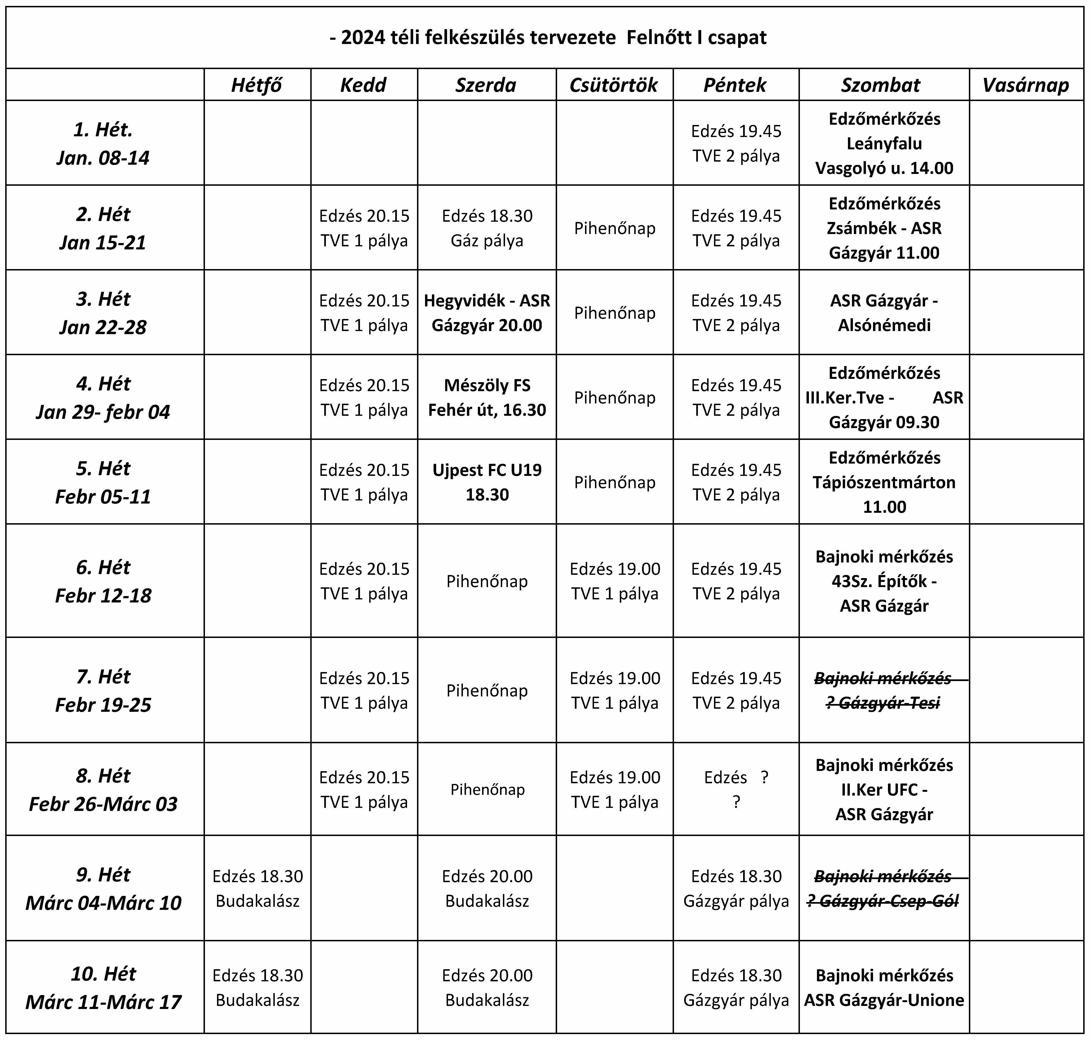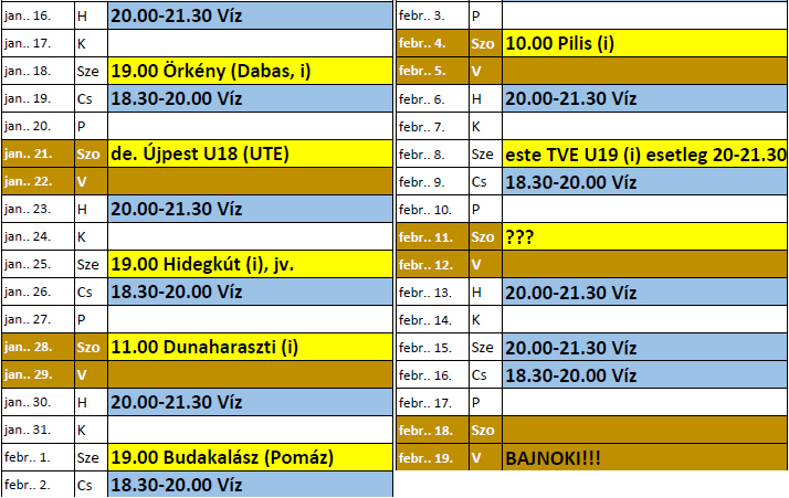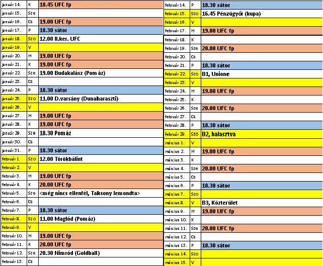 Itt van kettes csapatunk tervezett felkészülési programja is: Edzések: január 14-től február 13-ig hétfő-szerda ritmusban 19:00-től a II. ker. UFC-n Edzőmérkőzések: Itt van első csapatunk tervezett felkészülési programja: