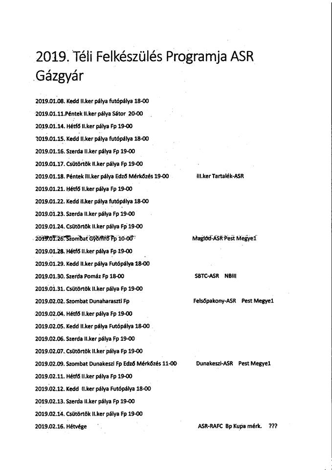 Felnőtt 16. forduló meccs eredménye itt, a beszámoló itt, a képek itt! A Pesti Foci beharangozója a 16. fordulóról: Sorsoltak a Budapest Kupában! A nyolcaddöntőben ellenfelünk a BLSZ II-es Közterület gárdája lesz, értelemszerűen idegenben. Ha innen továbbjutunk, akkor következhet a Tintahalak-Pestszentimre találkozó győztese! http://www.pestifoci.hu/index.php/tovabbi-friss-hirek-uj/3497-frisssorsoltakbk201617 Első csapatunk felkészülési mérkőzései: 2017.01.25. (szerda) 19:30, Kánai út: Mészöly Focisuli U19 - ASR Gázgyár 1-9 2017.01.28. (szombat) 16:00, Pomáz: Pomáz - ASR Gázgyár "kevés-sok" 2017.02.01. (szerda) 18:30, Újpest, Szilágyi u.: Újpest U19 - ASR Gázgyárr ELMARADT! 2017.02.04. (szombat) 14:00, Thököly út: SZAC - ASR Gázgyár 3-4 (2-3) (Gólszerzőink: Balogh (2), Fehér, Molnár) 2017.02.08. (szerda) 18:00, Hévízi út: III. kerületi TVE - ASR Gázgyár 3-1 (3-0) (Gólszerzőnk: Ivancsó 11-esből) 2017.02.11. (szombat) 12:30, Aranyosmarót (jelenleg Szlovákia): Lokomotíva Kozárovce (Garamkovácsi) - ASR Gázgyár 0-0 2017.02.15. (szerda) 19:00, Újpest: Újpest II. - ASR Gázgyár 2-3 (2-0) (Gólszerzőink: Balló (2), Mankó)