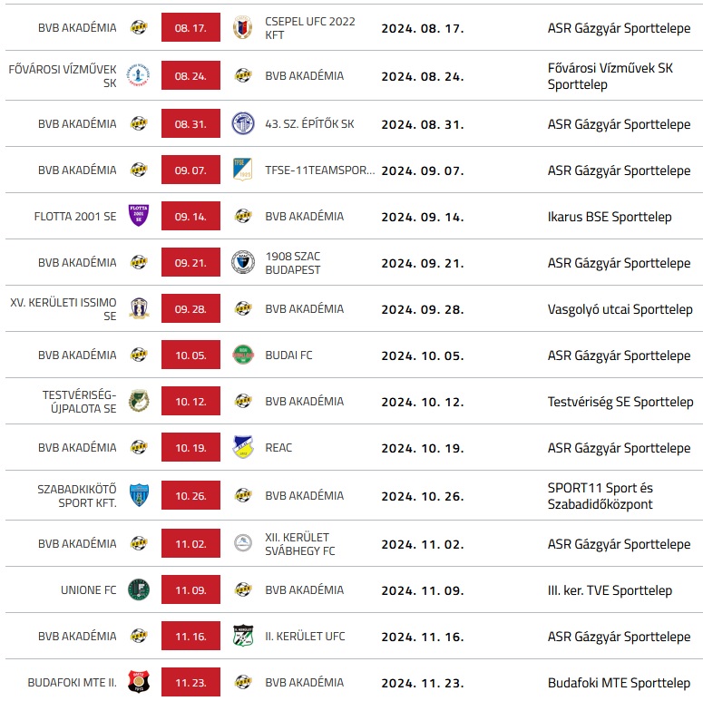 Tizenharmadik bajnoki fordulóbeli Ikarus meccs eredménye itt! A beszámoló itt, a képek itt! Tizenkettedik bajnoki fordulóbeli SZAC meccs eredménye itt! A beszámoló itt, a képek itt! Tizenegyedik bajnoki fordulóbeli Svábhegy meccs eredménye itt! A beszámoló itt, a képek itt! Tizedik bajnoki fordulóbeli Pestszentimre meccs eredménye itt! A beszámoló itt! Kilencedik bajnoki fordulóbeli 43. sz. Építők meccs eredménye itt! A beszámoló itt, a képek itt! Utánpótlás csapataink eddigi bajnoki eredményei: