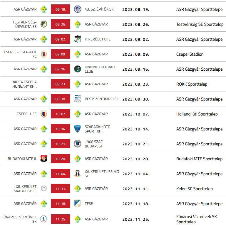 rendelkeznek védettségi igazolvánnyal, ezért védelmük érdekében, az ASR Gázgyár kéri, hogy lehetőség szerint a nézők viseljenek maszkot! 5. A rendelkezések a mérkőzésekre vonatkoznak, ezért az edzések továbbra is zárt kapusak maradnak! 6. A fenti szabályokat kérjük fegyelmezetten betartani, mert azok megszegése esetén 100 ezertől - 1 millió forintig terjedő büntetést szabnak ki a klubra, és a sportpályát is bezárhatják. Mindenki együttműködését köszönjük! az ASR Gázgyár sportegyesület vezetősége Huszonötödik bajnoki fordulóbeli Ikarus meccs eredménye itt! A beszámoló itt, a képek itt! Tizenhetedik bajnoki fordulóból elhalasztott Vízművek meccs eredménye itt! A beszámoló itt, a képek itt! Huszonnegyedik bajnoki fordulóbeli Pénzügyőr meccs eredménye itt! A beszámoló itt, a képek itt! Huszonharmadik bajnoki fordulóbeli Csep-Gól meccs eredménye itt! A beszámoló itt, a képek itt! Utánpótlás csapataink legutóbbi bajnoki eredményei: