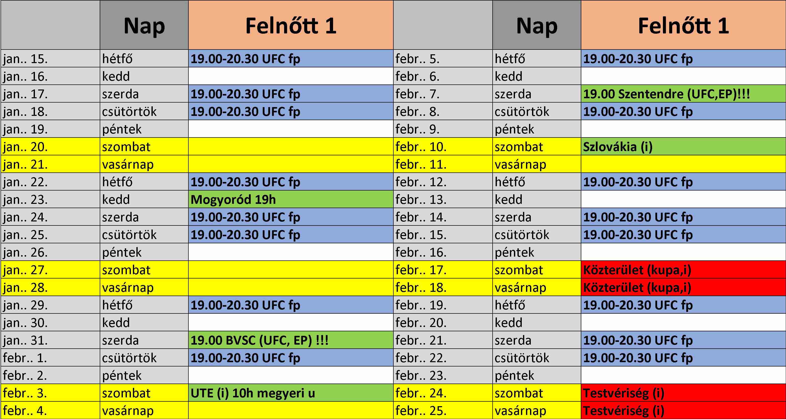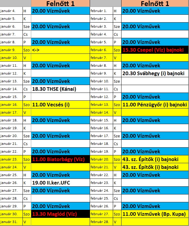 Itt van kettes csapatunk tervezett felkészülési programja is: Edzések: január 14-től február 13-ig hétfő-szerda ritmusban 19:00-től a II. ker. UFC-n Edzőmérkőzések: Itt van első csapatunk tervezett felkészülési programja: