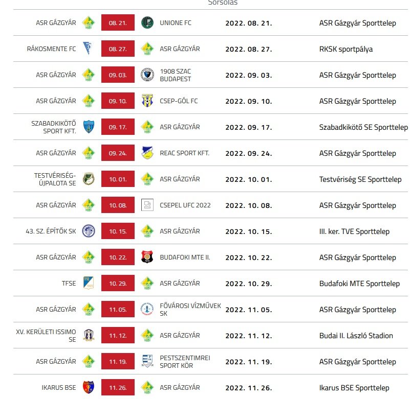 rendelkeznek védettségi igazolvánnyal, ezért védelmük érdekében, az ASR Gázgyár kéri, hogy lehetőség szerint a nézők viseljenek maszkot! 5. A rendelkezések a mérkőzésekre vonatkoznak, ezért az edzések továbbra is zárt kapusak maradnak! 6. A fenti szabályokat kérjük fegyelmezetten betartani, mert azok megszegése esetén 100 ezertől - 1 millió forintig terjedő büntetést szabnak ki a klubra, és a sportpályát is bezárhatják. Mindenki együttműködését köszönjük! az ASR Gázgyár sportegyesület vezetősége Huszonötödik bajnoki fordulóbeli Ikarus meccs eredménye itt! A beszámoló itt, a képek itt! Tizenhetedik bajnoki fordulóból elhalasztott Vízművek meccs eredménye itt! A beszámoló itt, a képek itt! Huszonnegyedik bajnoki fordulóbeli Pénzügyőr meccs eredménye itt! A beszámoló itt, a képek itt! Huszonharmadik bajnoki fordulóbeli Csep-Gól meccs eredménye itt! A beszámoló itt, a képek itt! Utánpótlás csapataink legutóbbi bajnoki eredményei: