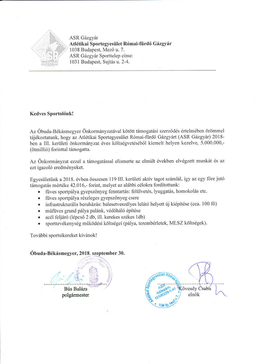 A III. kerületi önkormányzat tájékoztató levele klubbunk idei támogatásáról itt. Felnőtt I. csapatunk a Budapest Kupa 3. fordulójában a RAFC-ot fogadja majd 2019. február 16-17-én. Csapataink legutóbbi bajnoki eredményei: